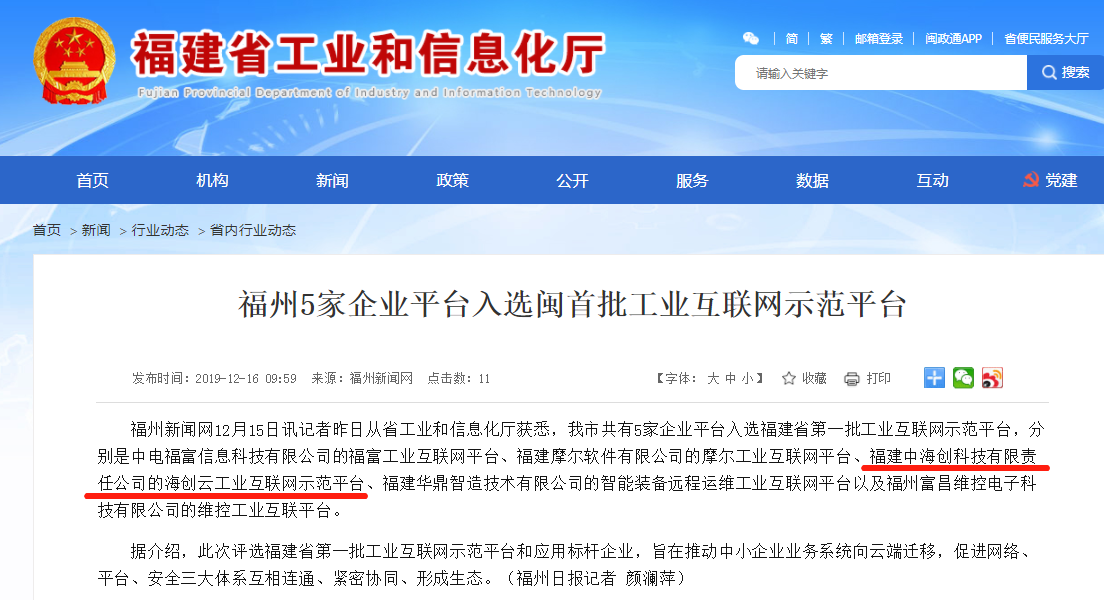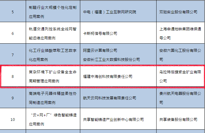 福建中华体会(中国)科技《复杂环境下矿山设备全生命周期管理》项目成功入选工信部2019年工业互联网平台创新应用案例。