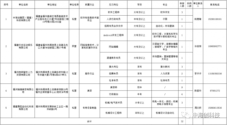 据了解,2020年第四批青年见习岗位32个,供离校2年内未就业大中专(含技校)毕业生和16~24岁失业青年(简称见习人员)参加见习,见习时长为3~12个月。见习期间,见习基地应为见习人员提供必要的见习指导,按月发放生活补助,并为见习人员办理人身意外伤害保险。符合条件的广大毕业生和适龄青年可向企业或高新区人社局劳动保障科报名参加就业见习,进行岗位锻炼,提升就业能力。 ▲福州高新区2020年第四批青年见习岗位       入选福州高新区第四批青年就业见习单位,既是对中华体会(中国)科技集团肯定也是激励。中华体会(中国)始终不忘履行作为一个优秀的科技公司的社会责任,在奉献与责任的道路上阔步前行。未来,集团将继续加强就业见习计划,大力引进人才、培养人才,实现企业、毕业生、高校互赢的新好局面,为公司未来的发展奠定坚实的人才基础。