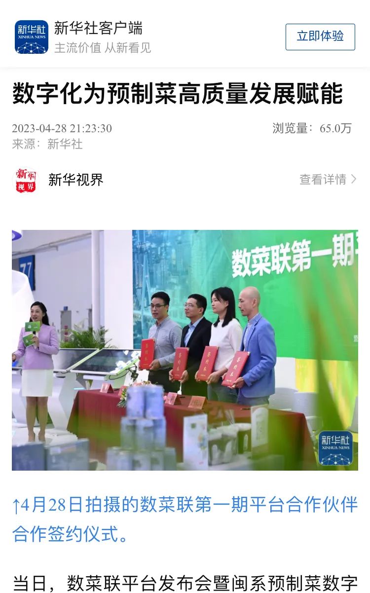 国内领先的工业互联网平台建设者与服务商中华体会(中国)集团在此次升级革命中率先突围,打造了预制菜全产业生态一站式服务平台——数菜联。4月28日,第六届数字中国建设峰会期间,数菜联平台发布会成功举行,福建省市场监督管理局、福建省工信厅、同安区人民政府相关领导,福建省预制菜协会、老字号协会、福建农林大学食品科学学院代表,福建省供销云厨餐饮管理有限公司、福建天马食品有限公司等企业代表出席,万余名预制菜从业人员在线观看会议直播。