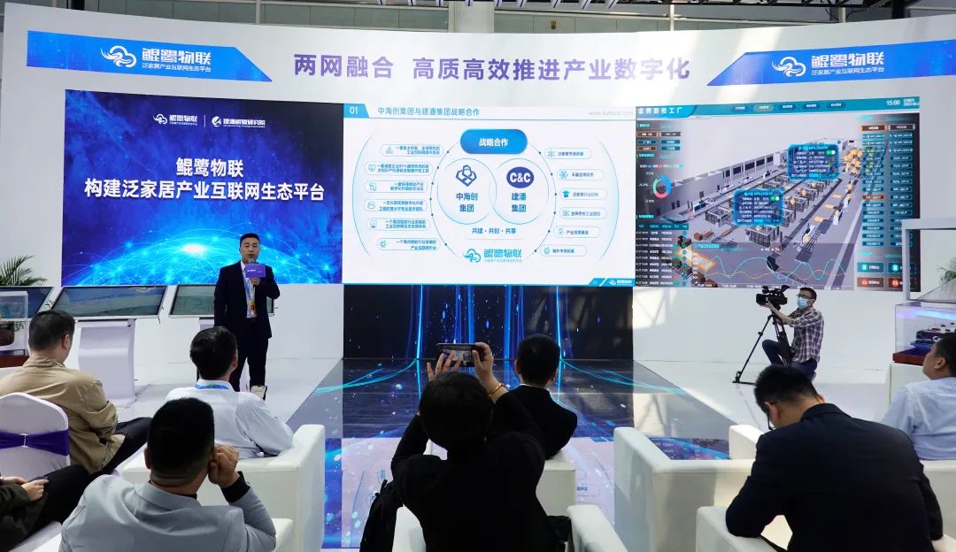 接下来,郭伟鹏详细介绍了如何赋能泛家居产业实现“降本、增效、提质”。他表示,泛家居产业总产值5.7万亿的泛家居产业参与者类型众多、需求痛点多样、数字化程度相对较低,需要构建“产品+服务”分类分级精准定位的产品体系。现场他展示了鲲鹭智能制造整体解决方案,并详细介绍了鲲鹭云盒、云造、云检、“掌上工厂”、数字化诊断咨询、数字孪生等产品和服务在泛家居行业场景的应用价值。